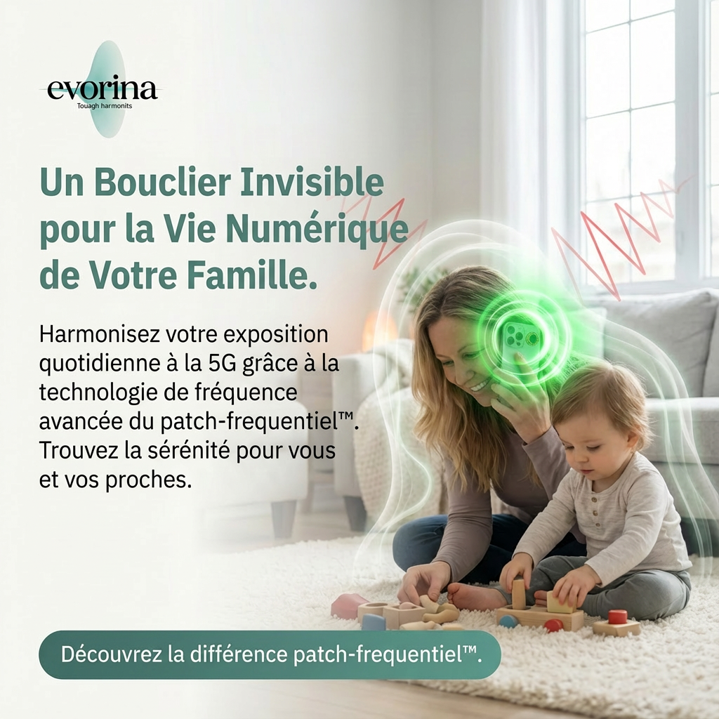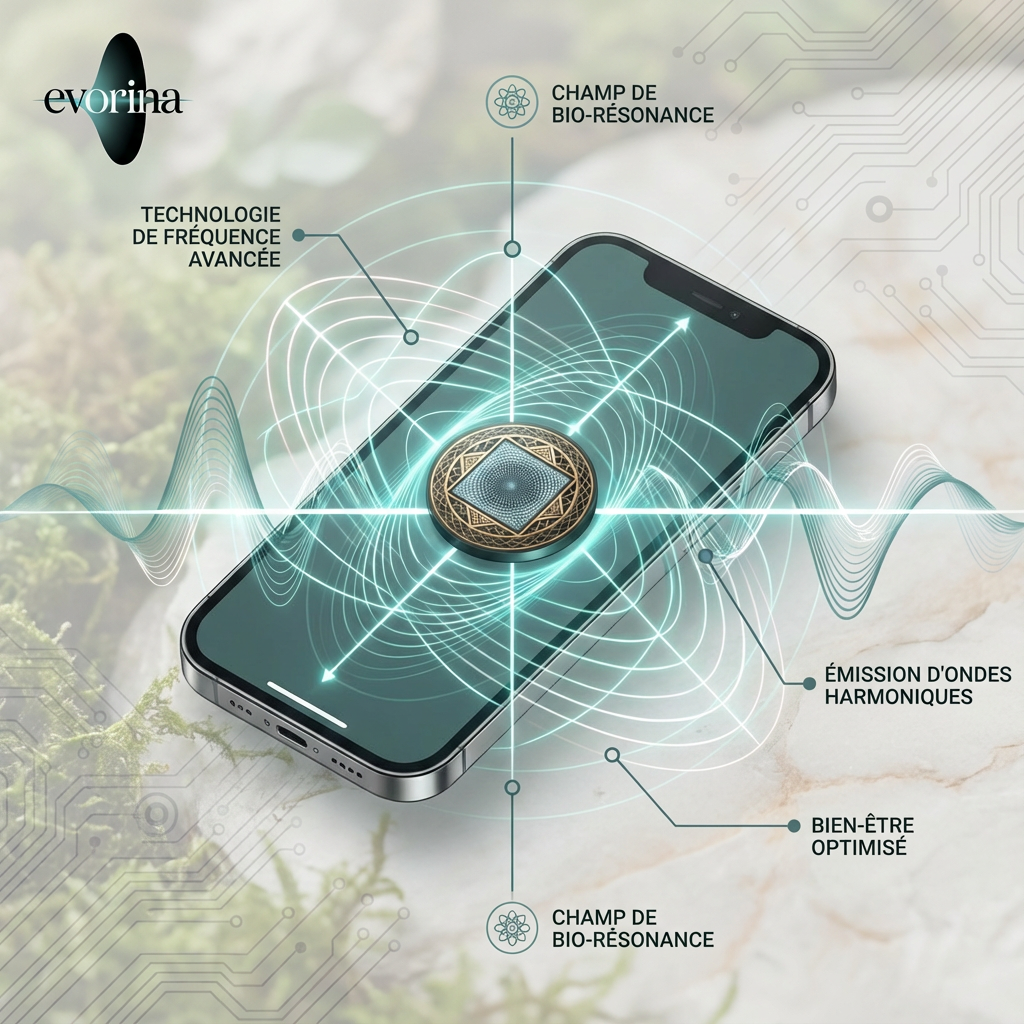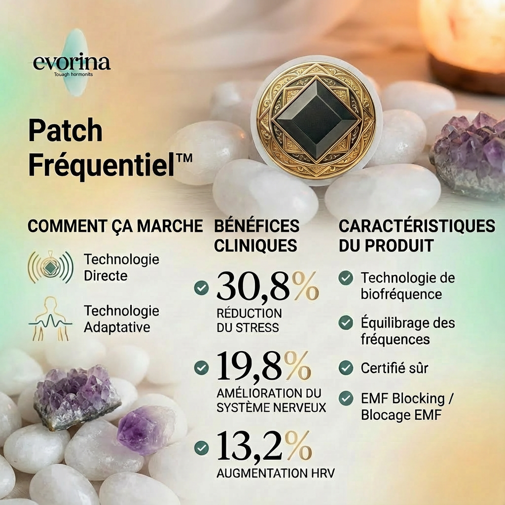 Le Patch Fréquentiel™ Evorina est un dispositif passif de bien-être conçu pour accompagner le corps dans un environnement numérique moderne, en aidant à équilibrer l’exposition aux ondes électromagnétiques du quotidien.